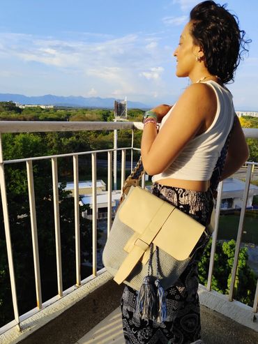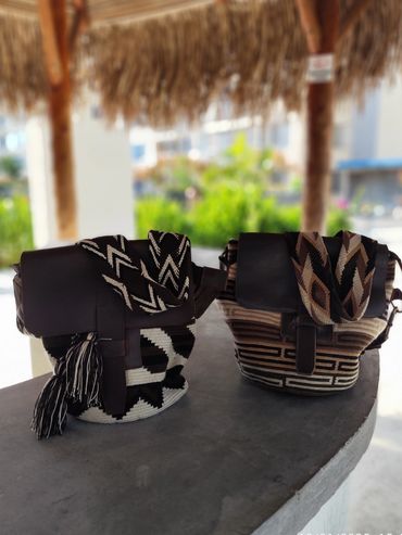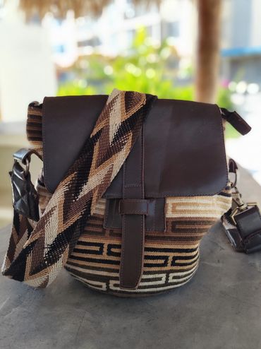 Tejidos ancestrales combinados con cuero genuino de alta calidad.